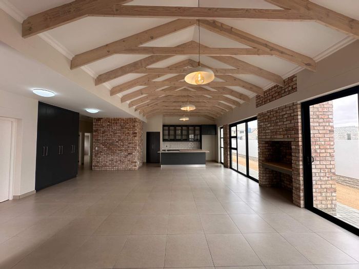 Upmarket, relaxed living in Kramersdorf near dunes and riverbed; pet-friendly complex. Modern townhouse with indoor braai entertainment area, stylish kitchen, three bedrooms, two bathrooms, double garage.