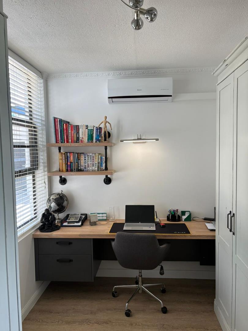 A glass-and-aluminium barn-door enclosed study with “his and hers” desks creates the perfect work-from-home environment.