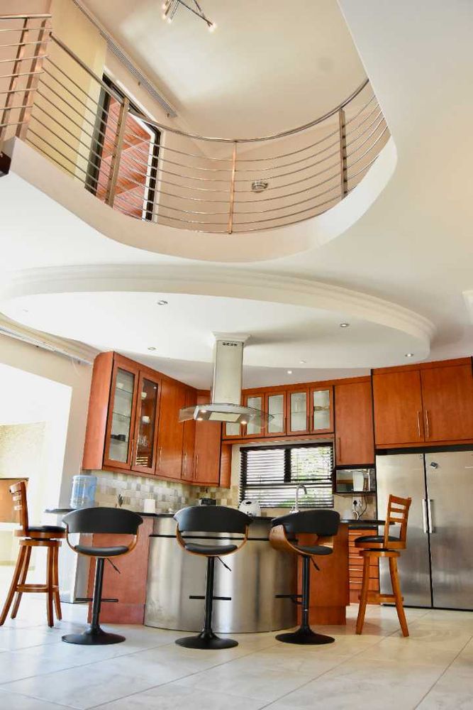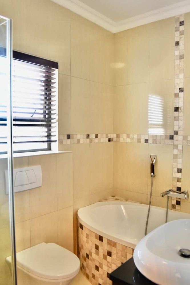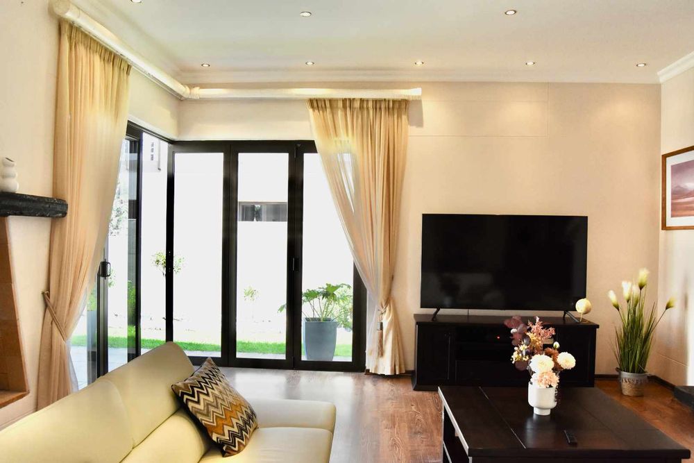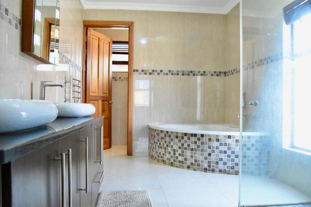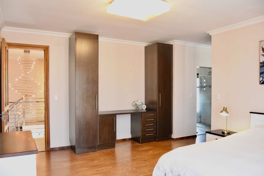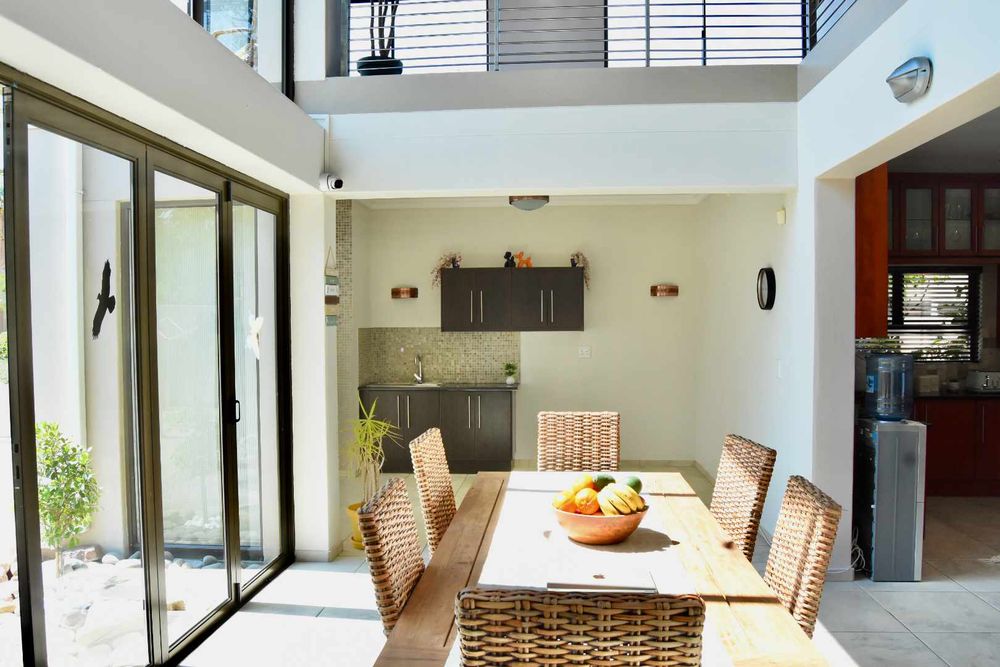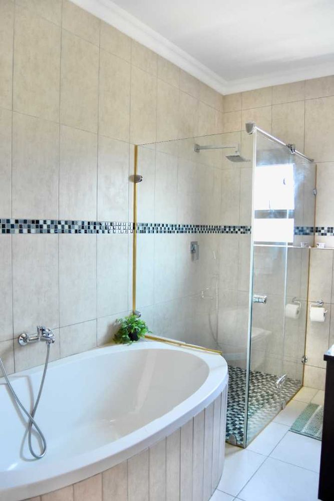 Designed with both relaxation and entertainment in mind, the home offers a variety of leisure spaces: an upstairs patio balcony, a stylish indoor braai area, a welcoming boma, and a jacuzzi, all set within a beautifully landscaped garden.