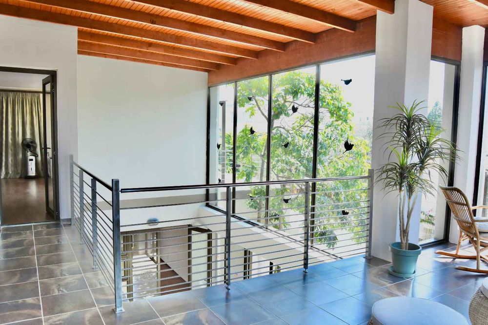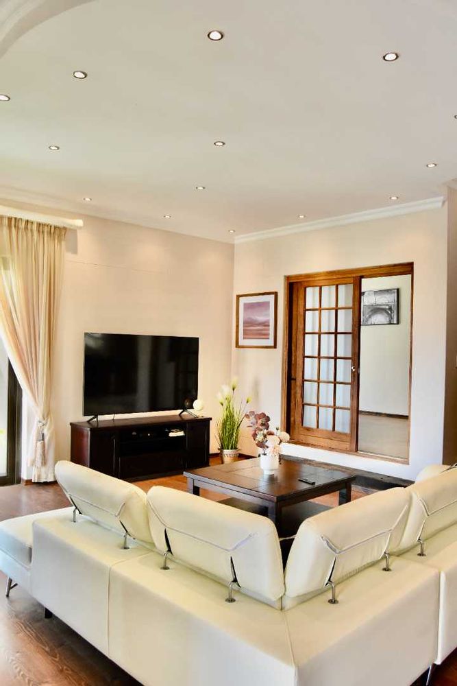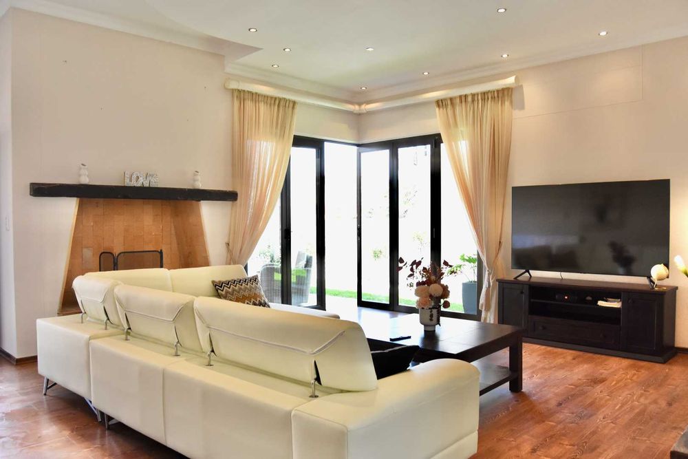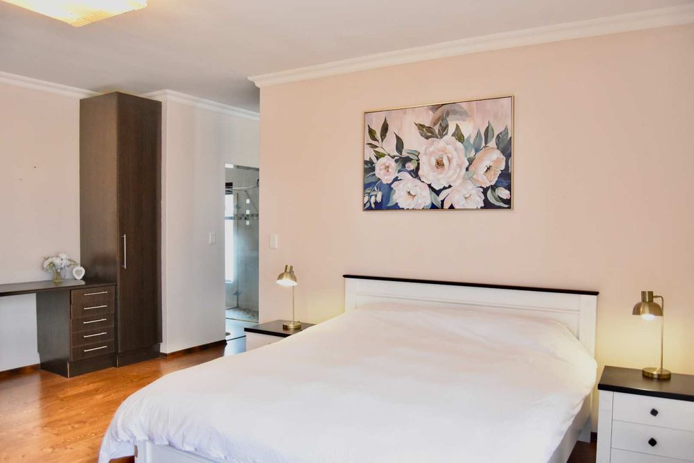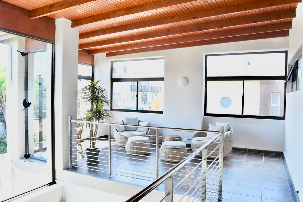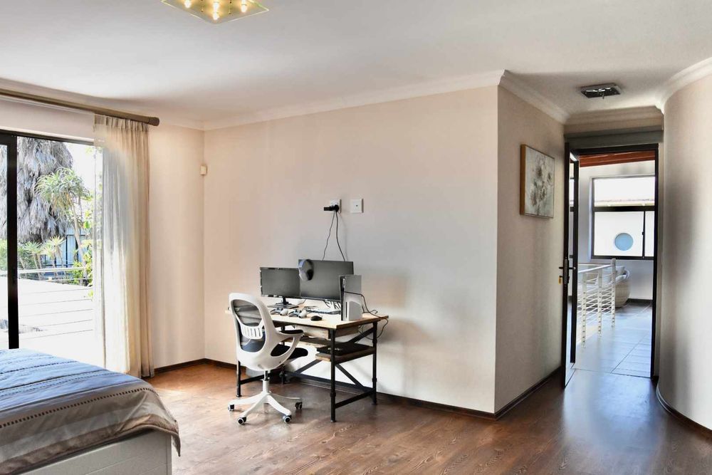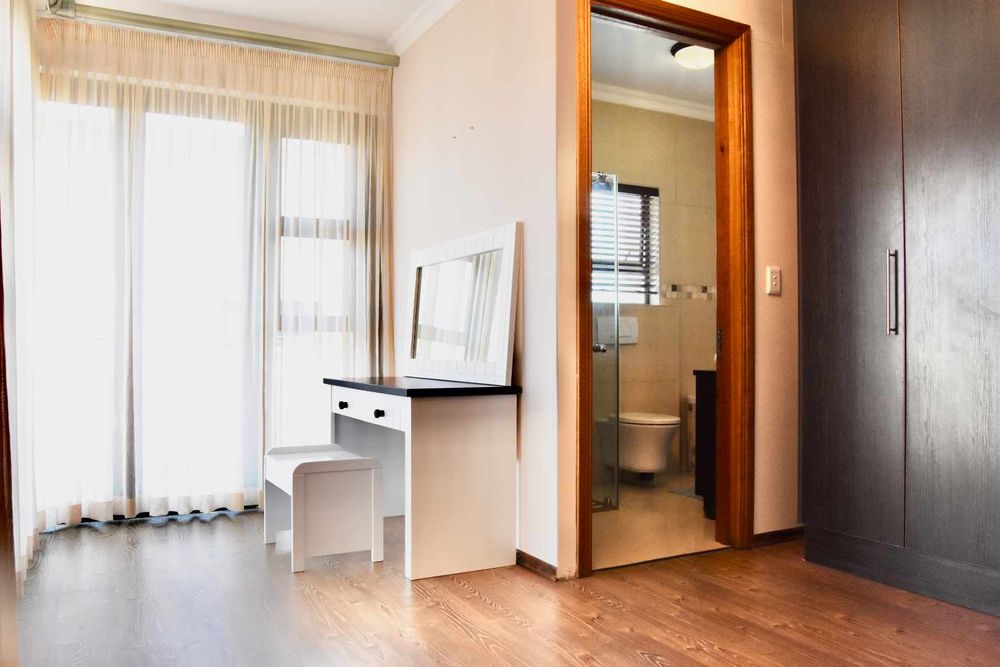 Designed with both relaxation and entertainment in mind, the home offers a variety of leisure spaces: an upstairs patio balcony, a stylish indoor braai area, a welcoming boma, and a jacuzzi, all set within a beautifully landscaped garden.
