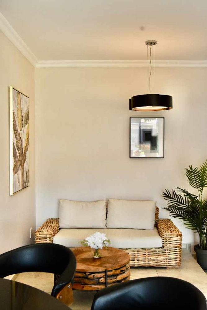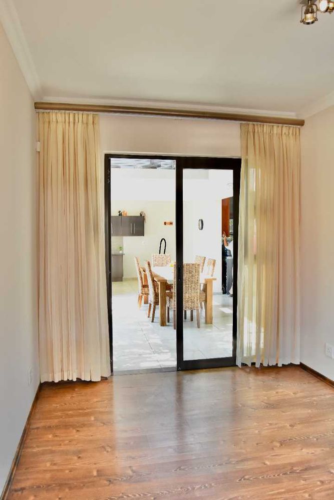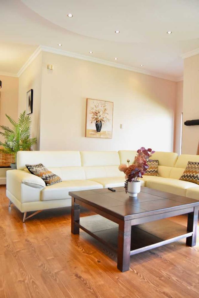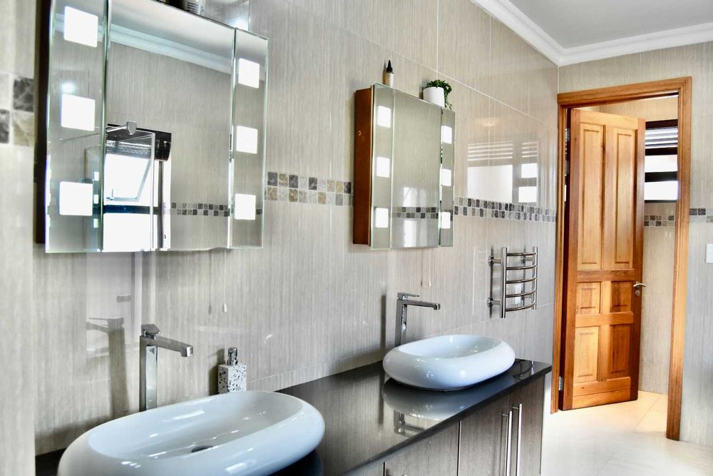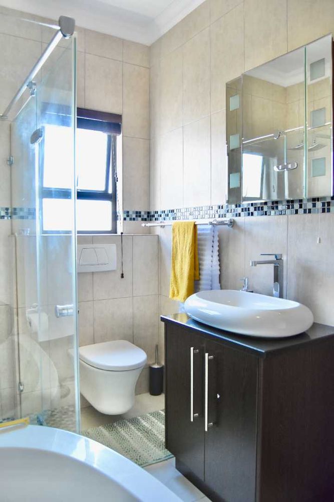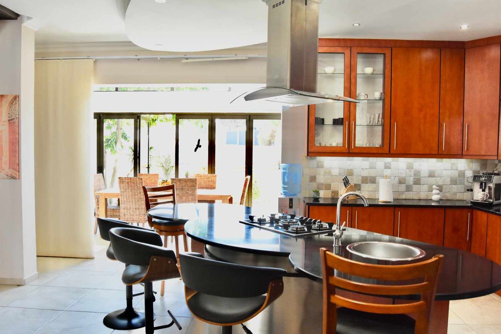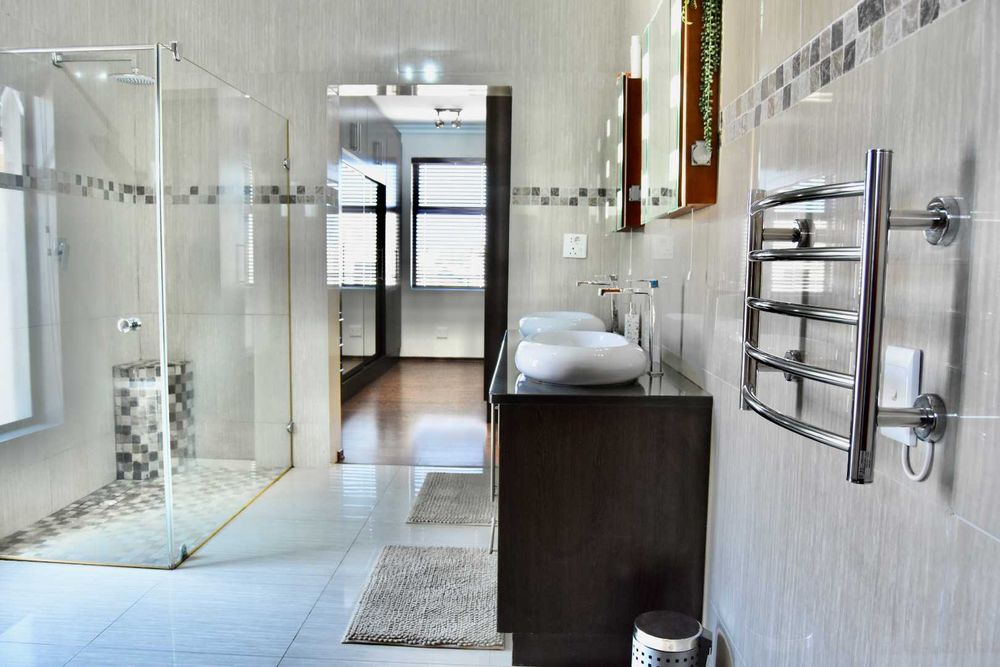 Designed with both relaxation and entertainment in mind, the home offers a variety of leisure spaces: an upstairs patio balcony, a stylish indoor braai area, a welcoming boma, and a jacuzzi, all set within a beautifully landscaped garden.
