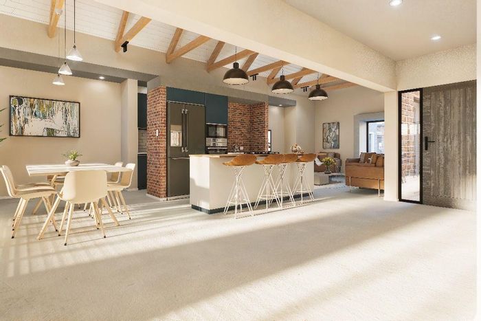Effortless modern living in a tranquil suburban setting, designed for entertaining with an inside braai and airy open-truss roof; chef's kitchen, study, three bedrooms, three-and-a-half bathrooms, double garage.
