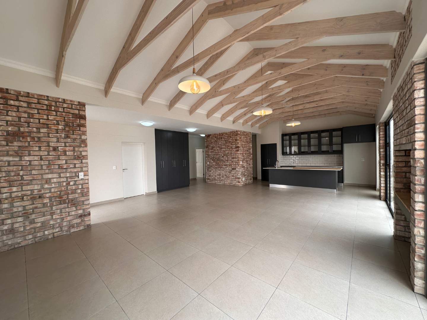 As you step inside, you are greeted by an expansive open-plan layout that seamlessly integrates the kitchen, lounge, and dining areas. The kitchen is a chef’s delight, equipped with top-of-the-line appliances, ample storage in the pantry, and a convenient scullery. The exposed roof trusses add a touch of architectural beauty and spaciousness to the living areas.