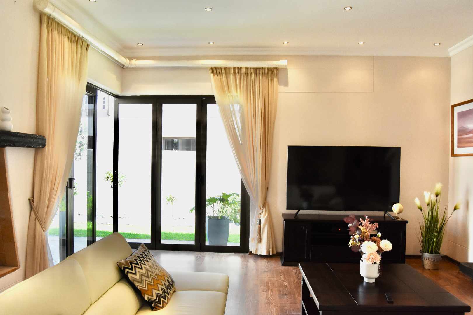 Designed with both relaxation and entertainment in mind, the home offers a variety of leisure spaces: an upstairs patio balcony, a stylish indoor braai area, a welcoming boma, and a jacuzzi, all set within a beautifully landscaped garden.